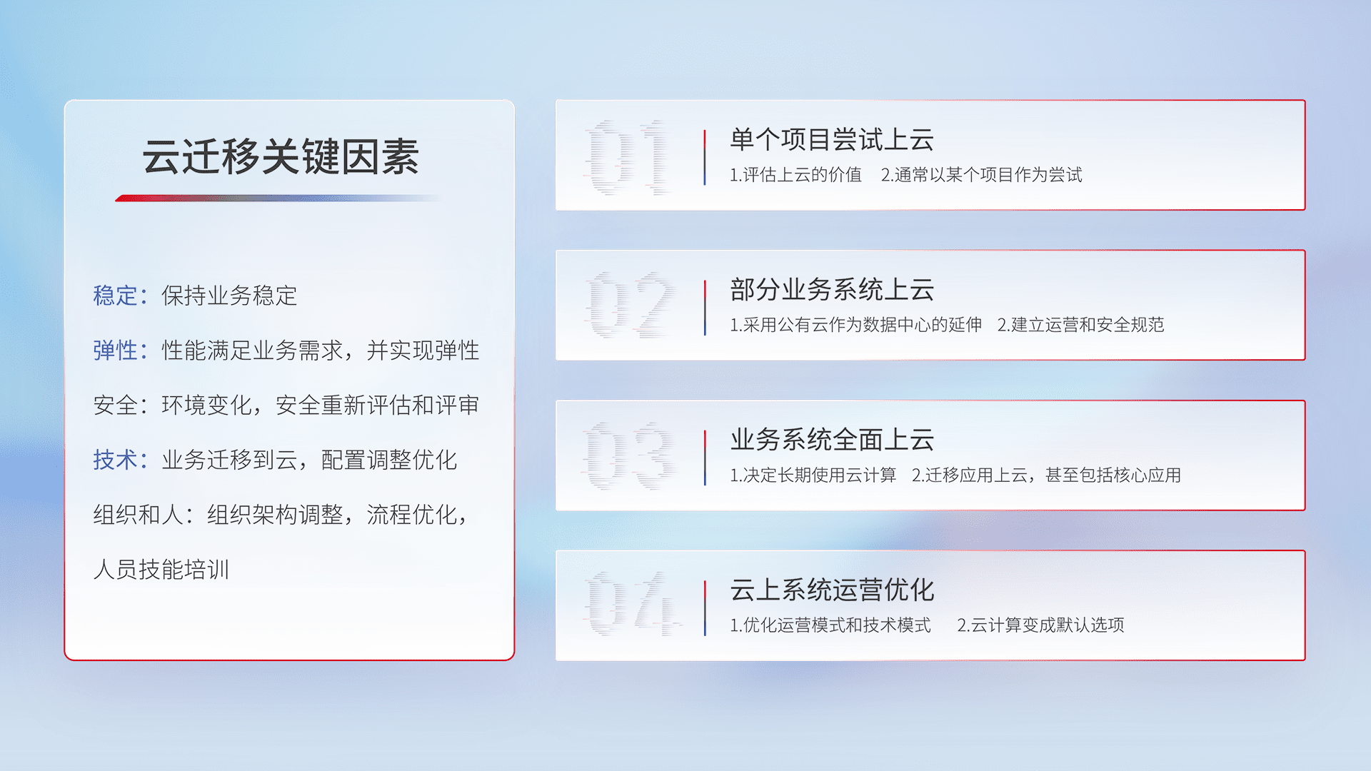 结合实际业务,,,从规划设计、、、、云平台选型、、、云原生改造、、、、数据迁移、、集成交付,,,迁移全过程为客户识别最佳上云路径,,,,做好风险识别管理,,设计网络架构、、身份权限、、安全审计合规、、、、操作审计、、、、日志审计、、、、监控告警策略、、、、多站点容灾设计等,,,对云上基础设施进行整体规划,,,提升IT治理水平,,以满足弹性、、、高可用、、、高性能的需求。。。