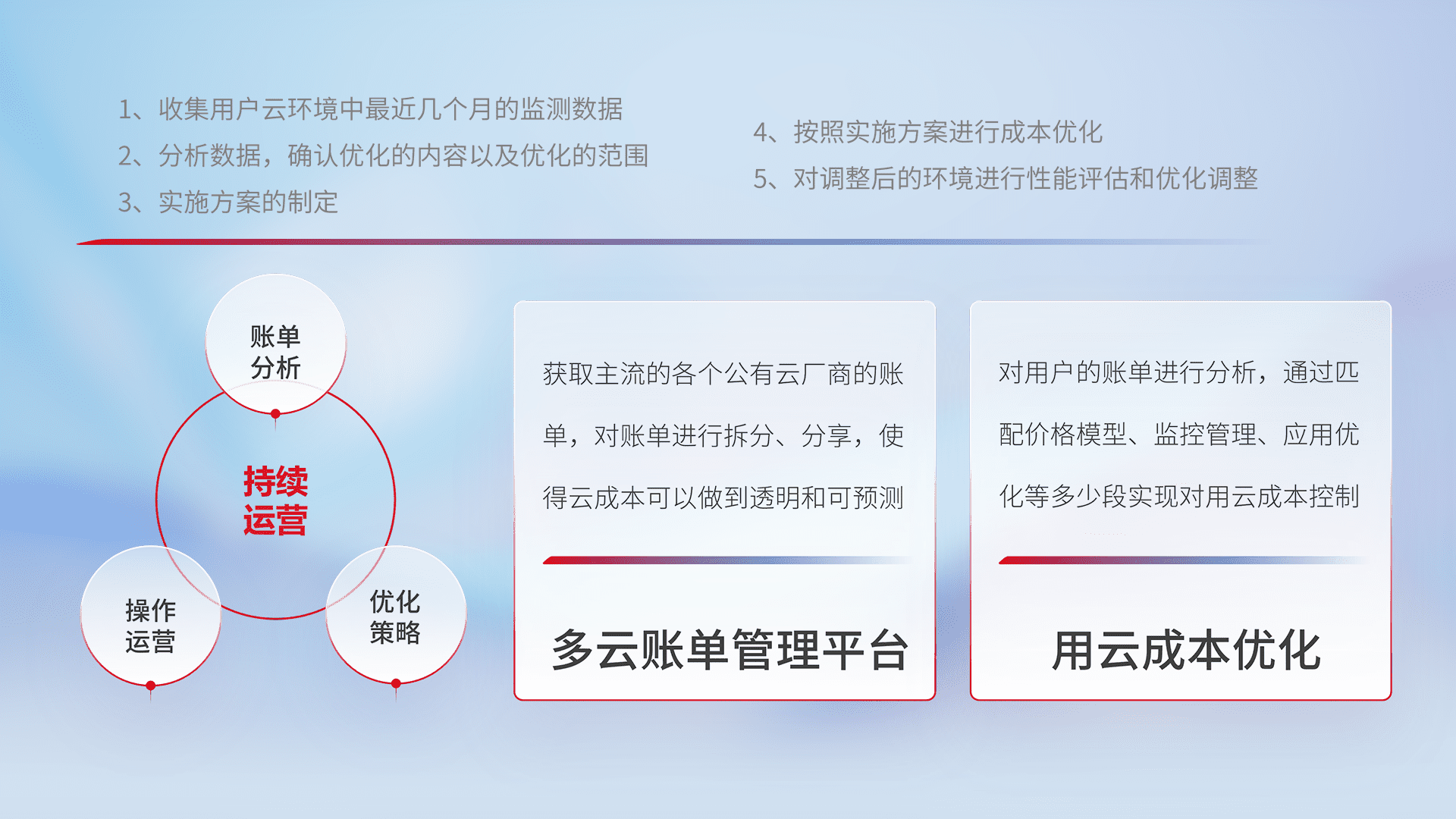 通过多云纳管,,,以统一的资源数据模型把客户的云资源进行抽象和封装,,进而实现对多云资源的统一操作,,,保障云资源管理的可靠性、、稳定性与可用性。。量身定制化运维内容,,,,配置、、、、开发运维、、、、补丁管理、、备份、、、监控、、认证和访问管理、、、、审计和日常巡检等,,,保障在用云过程中的可靠度,,稳定度以及高可用率。。。。